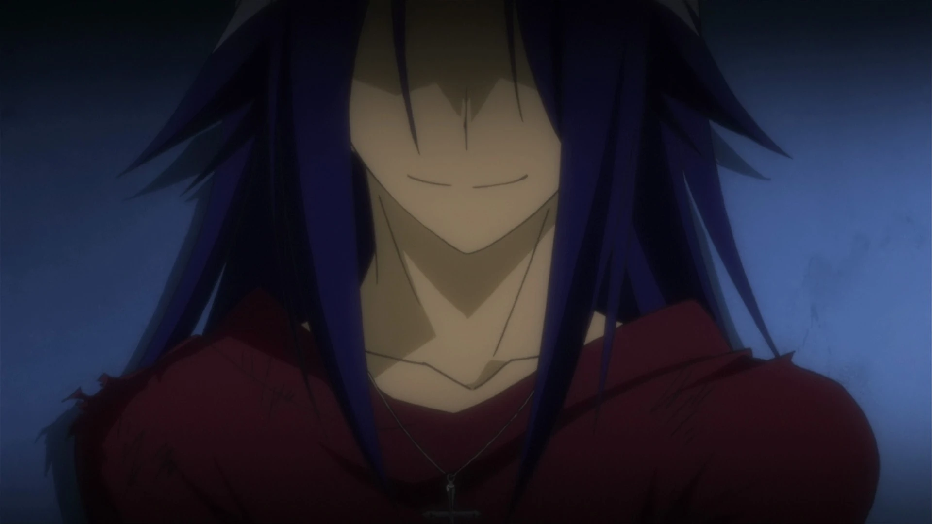 Maguro has waist-length purple hair and two ahoges on his head; very similar to Medaka's hair style. He wears a purple shirt, violet wristbands, and a cross around his neck. He also wears a pair of green pants with a matching belt that is decorated with a skull and crossbones. He occasionally wears a jacket as well. Maguro originally had multiple sutures across his chest and some innards missing (his left kidney, 20% of his heart, 50% of his liver, 75% of his stomach, five arteries, and three veins), which the Flask Plan took as samples.[5] Both the scars and the missing organs were healed by Misogi Kumagawa when he came to Hakoniwa Academy.[6]