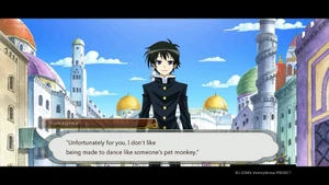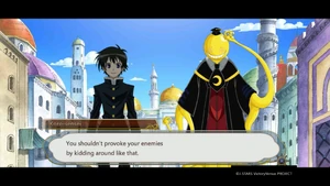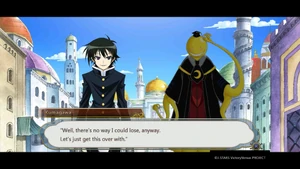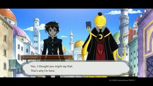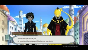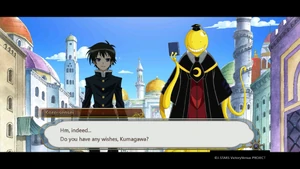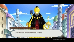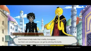 The group makes their way to another area to start the final round. Kumagawa makes no comment when Medaka chooses to release Ajimu and Hanten first.[137] In the new area, Naze and the others listen on as the rules of the game are laid out.[138][139] Kumagawa stands by as the game finally gets under way.[140] Kumagawa comments on possible strategies, pointing out that Momozono's position allows her to attack Medaka directly.[141] Kumagawa is surprised when Medaka chooses to leave the room.[142] As Medaka continues to leave each time after her turn, Kumagawa wonders at what her plan is.[143] When Torai confronts Medaka on her behavior, Kumagawa wonders why she is so adamant about challenging Medaka. He is not surprised when Medaka declares that she will not fight a fight that shames her friends.[144] Having heard Momozono's explanation, Kumagawa wonders at how Fukurou could have orchestrated all that has happened after his death.[145] He appears unfazed when Momozono continues with the game mid-explanation.[146] He makes no reaction when Momozono points him out as someone who was able to escape her seal.[147] Kumagawa comments on the nature of Shiritori; what makes the game so hard - the players need to keep every syllable in their head, with the winner being the person with the best memory.[148] As the audience discusses each player's standing, Kumagawa notices that Kousan ends with N, which is illegal in Shiritori.[149] Kumagawa listens on as Momozono reveals Medaka's true plan; to force the suitor to end with "surrender" by manipulating the entire audience not to use the necessary syllables.[150] Explanations finished, Kumagawa asks Torai if she is satisfied with Medaka.[151] Kumagawa is present when Zenkichi is healed. He is surprised by Medaka's reaction to Zenkichi's depression. Together, the Student Council and the All Jokers (and Namanie Nienami) return to Hakoniwa Academy.[152]