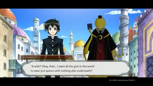 In the dream classroom, Kumagawa meets Ajimu, who asks him how he died; Kumagawa does not respond to her prodding however. Kumagawa tells her that All Fiction is nothing more than a magic trick, just like Ezumachi's skill. Kumagawa apologizes to Ajimu, saying the skill is still beneath her. Kumagawa bleakly accepts her encouragement, saying he might try fighting her sometime. As Kumagawa leaves, he addresses her as Vice-President Ajimu; Ajimu tells him to call her Anshin'in. Kumagawa wakes up in the Student Council room to find the school day has ended, having been brought there by Sukinasaki. Kumagawa grabs his jacket, and, questioned by Sakinasaki, tells her that he will go meet Ezumachi again. Kumagawa explains that his reason for fighting is to defend the color of girls' panties. As Kumagawa and Sukinasaki walk through the school, they find Ezumachi has changed the colors of the entire building. Kumagawa asks Sukinasaki why she did not defect to Ezumachi's side since he would make a better president. Sukinasaki's answer is that no one would make a good president. Kumagawa and Sukinasaki find Ezumachi on the soccer field. Kumagawa says he cannot abide by Ezumachi defacing the school but offers a deal: he will ignore Ezumachi's actions if he gives Kumagawa the power to choose the colors of panties everywhere in the world. Ezumachi turns Kumagawa's shirt gray and destroys it to reveal Kumagawa's skin. Kumagawa pierces Ezumachi's shoulder with a screw however, revealing that he has erased blue from the world. As Ezumachi tries to grab the red paint, Kumagawa erases the existence of red as well. Ezumachi goes mad, begging Kumagawa to stop erasing colors. Kumagawa tells him that he only planned to get rid of the twelve basic colors, but since Ezumachi expects him to get rid of all colors, he must comply. Using All Fiction, Kumagawa changes the world to only black and white. Kumagawa assures Ezumachi that, while his power over color is gone, the colors of panties are eternal. Ezumachi lunges at Kumagawa, only to be pierced by several of Kumagawa's screws from beneath. Restating his childhood motto, Kumagawa congratulates Ezumachi on hitting a vital spot (Kumagawa's eye). Sukinasaki asks Kumagawa if he has finally earned a victory. Kumagawa denies it because the world is white, and states he has lost again. Later, he remembers he did not erase the color black, and uses All Fiction to erase that as well.[17]