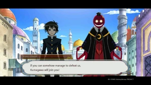 Ajimu drives Medaka, Zenkichi, and Kumagawa to meet Shiranui in a jeep, prompting Kumagawa to question why she doesn't use one of her skills to transport them.[156] Meeting Kairai again, Kumagawa comments that he has recovered well from Ajimu's beating.[157] At Ajimu's order to heal Kairai (having defeated him with a hundred skills again), Kumagawa expresses his distaste at healing a man's injuries.[158] Due to the terrain, the group abandons the jeep and advances on foot.[159] The group eventually comes to a three way branch in the path. As Medaka ponders which route choose, Kumagawa questions what she plans to do about Shiranui. Medaka asks him if he has given up on defeating her; Kumagawa declares (without brackets) that he still intends to defeat her before he graduates.[160] Kumagawa and the others are surprised by the appearance of the Gate Guardians "Doppelgangers".[161] Kumagawa fights his doppelganger. Tired, Kumagawa falls back with Zenkichi. They both are surprised that Ajimu and Medaka are having problems against their doppelgangers as well. Kumagawa asks for a plan of action from Zenkichi; Zenkich claps for everyone's attention. At Zenkichi's prompting, the members of the group switch opponents; Kumagawa defeats Ajimu's doppelganger.[162] Obi arrives to congratulate the group and introduce herself. She then explains the next game - tag. She starts counting down but Medaka punches her instead, an act that horrifies Kumagawa and Zenkichi. Obi acknowledges Medaka's answer as correct and lets the group inside the village.[163] Arriving at the gate of the mansion, Obi gives Medaka the final test: predict what the final question is, in ten seconds; even Kumagawa thinks such a test is impossible. He watches on as Medaka answers the final question.[164] After Medaka supplies the right answer, the group enters the mansion to meet Shiranui.[165]