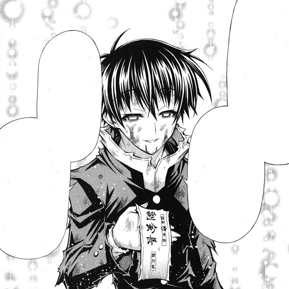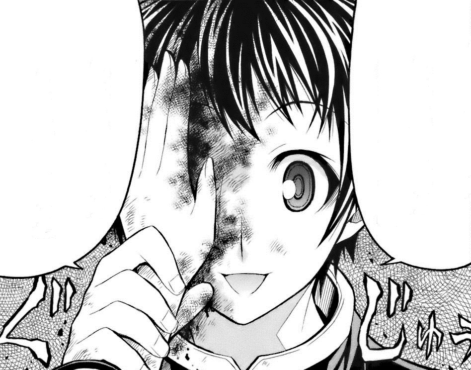 Described as a "Born Loser" who failed at everything, who lost to everyone at everything, which in turn made him stronger than everyone. He was always negative, and could hurt people as easily as you and I breathe. His need to destroy was as strong as one's need to eat. He was the type that seriously contemplated killing every human on the face of the planet, himself included. Medaka didn't see that as an obstacle, so she tried to talk to him, to sympathize with him. She never once thought that she'd lose, but she couldn't defeat Kumagawa, which led her to using Perses Mode for the first time. She attacked him and forced him to leave the school, but she still felt crushed by the fact that she couldn't do anything positive for him. To this day, she still berates herself for not being able to help Kumagawa.