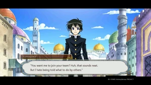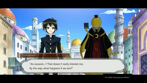 Two months prior to his arrival at Hakoniwa Academy, Kumagawa transfers into Suisou Academy.[13] When the other students laugh at his joke of having transferred from Weekly Shōnen Jump, he attacks the entire class with his screws, only to undo the damage an instant later. This terrifies the whole class. Kumagawa is later approached by Saki Sukinasaki; that she would start a conversation with him makes him happy enough to start crying. He listens as Sukinasaki describes the school's Student Council president and Monarch, Aki Jakago. After hearing of her Abnormality, Kumagawa agrees to meet with her, commenting that it might be just the skill he is looking for.[14] Upon meeting Jakago, Kumagawa mentions what he has heard of her, claiming to have respected her for ten years. When Jakago begins to suffocate Sukinasaki, Kumagawa panics, crying out that his childhood friend from age two is going to die (parodying the relationship between Medaka and Zenkichi). He begs Jakago to stop, who compiles. She then offers him her hand, only to withdraw it before Kumagawa can shake hands with her. He asks her if anything is wrong, and after she replies in the negative, dismisses him.[15]