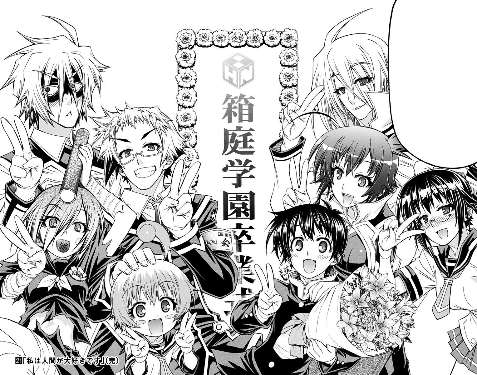 At the end of the academic year, Kumagawa is among the graduating students present at the Hakoniwa Academy graduation ceremony.[233] After Zenkichi's speech, Kumagawa is introduced as the speaker for the class. Kumagawa thanks Zenkichi for the speech, and says he has failed all his university exams. He laments graduating, asking sadly why they would want to send him to the real world. He lists all his failures in the past at Hakoniwa, but says he had a great school life. He had always been transferring schools so he never felt this way. He admits he was afraid that, with Ajimu and Medaka gone, he might revert back to his old self, but he did not, proof he could never make interactions with others not exist. Kumagawa assures everyone that, no matter what they are struggling with, they should keep in mind that he is much more unfortunate, yet living a happy life. He ends by saying that he will not be graduating from Shōnen Jump even if he graduates from high school. As everyone claps, the doors to the gymnasium slowly open. Hearing that he won their bet, Kumagawa sheds tears at Medaka's return, stating that he has finally won.[234] Holding a bouquet, Kumagawa joins his friends for a group photo after the ceremony ends.[235]