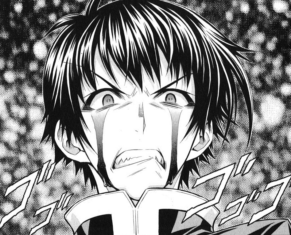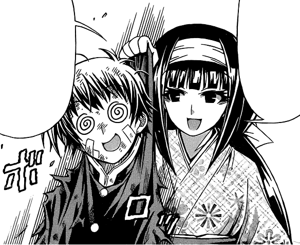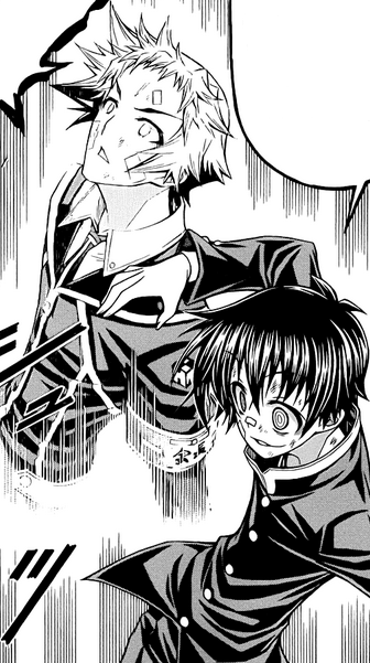 Despite many attacks by Shiranui, Kumagawa has dodged everything by a hair's width and looks almost fine. Shiranui tells Kumagawa to stand still, since he wants her to use Real Eater on him. Kumagawa rubs his chin in thought, and says that the plan is trivial now because he is happy to just battle Shiranui fair and square. Shiranui jumps at Kumagawa. Kumagawa steps back and smiles as he knows where she will land, and strikes at the landing place. Shiranui, however, screws herself to the roof with a corkscrew, and drops down to elbow Kumagawa in the face. Shocked, Kumagawa falls backwards and is pierced by his own screws. Shiranui takes Kumagawa's head and prepares to use her Real Eater on him.[202] Before Shiranui can use Real Eater, the screw piercing Kumagawa grows and stabs Shiranui as well. Kumagawa reveals that all the screws on the floor are Book Maker screws; he hid the tops of the screws from her so she would not realize. Kumagawa states that she was already in the palm of his hand since the beginning and that he is ahead of her when it comes to making fools out of others. Kumagawa states he never intended to save Zenkichi, and even adds he doesn't know him. Kumagawa asks Shiranui to come with him back to Hakoniwa Academy and rebuild the memories lost.[203] Shiranui still tearfully pleads for Zenkichi's revival; Kumagawa stops her, saying that begging is useless, thinking she is lying. Zenkichi appears and stops Kumagawa's screws, before knocking the older boy to the floor.[204] Kumagawa gets back up and wipes a tear form his eye, complimenting the heartwarming moment between friends, and asks to join in the group hug. Shiranui and Zenkichi prepare to beat up Kumagawa instead, but are interrupted by his cell phone. The caller is Obi, who, after Kumagawa hands the phone over to Shiranui, warns them that Iihiko is on the way.[205][206]