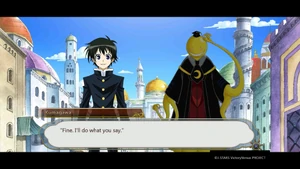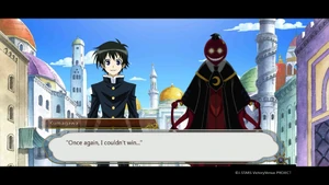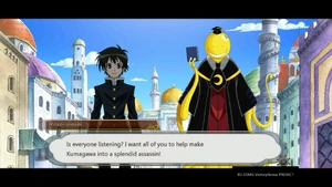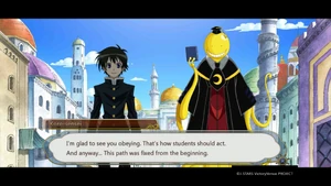 Back at the academy, Kumagawa is treated by Aoki Aka, though his wounds refuse to close and he remains unconscious.[177] Kumagawa meets Ajimu in the dream world classroom.[178] Ajimu explains that what he is seeing is just a recording; Kumagawa lifts up her skirt. Having predicted how he would act, the Ajimu recording kicks Kumagawa in the head.[179] Kumagawa accepts Ajimu's inheritance in the form of two parcels, each containing a skill: Hundred Gauntlets, which will stop the deterioration of his All Fiction, and the second, which is a surprise. Kumagawa insists that wanting to win and being able to win are different things, though the recording insists that she cannot hear him. Bothered by Kumagawa's pessimism, Ajimu gets up, goes to the window and looks for the loser star Kumagawa was born under. After Kumagawa picks one out, Ajimu destroys it, shocking Kumagawa. He is further surprised when she hugs him, assuring him that he is a star of hope for the weak, and that he was like a cute little brother to her.[180] Kumagawa regains consciousness shortly after. He thanks Aka, and with the arrival of Medaka, states one loss is not enough to break his will. Back in uniform, he asks Medaka for their plan as the group makes their way out of the academy.[181]