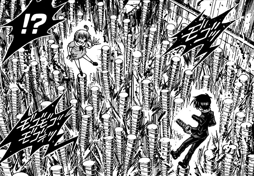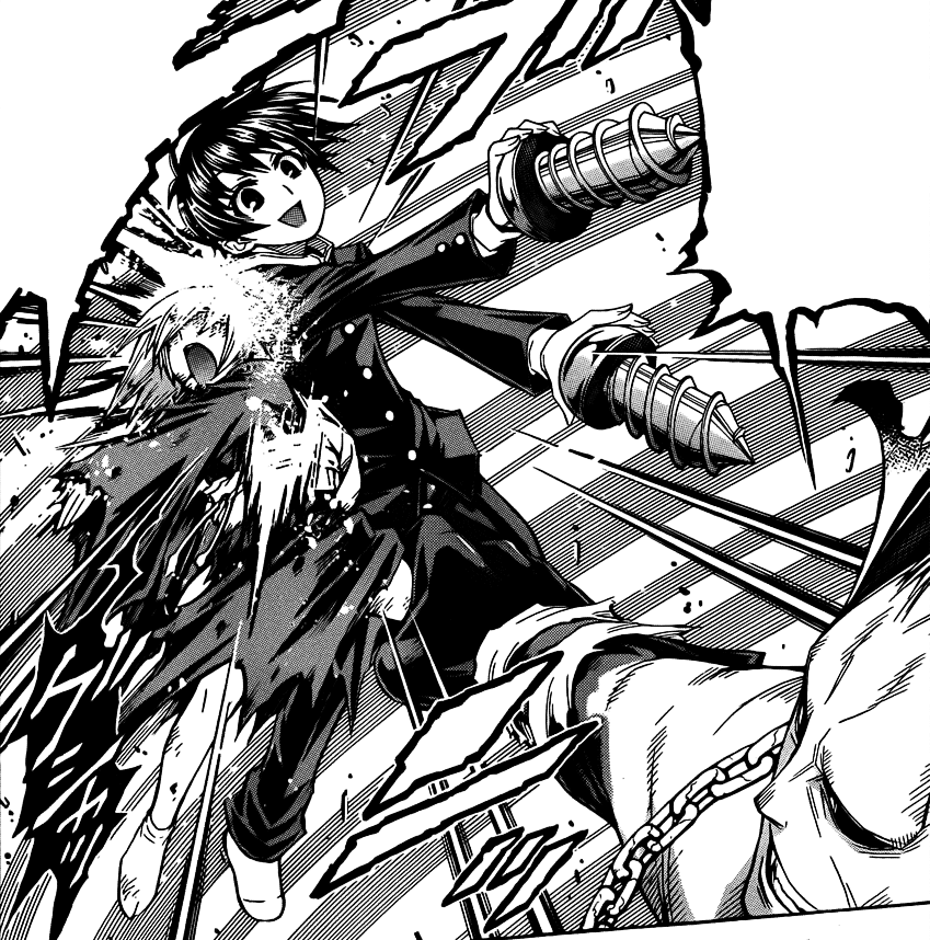 Kumagawa defeating the Candidate Student Council with his screws, but without All Fiction.